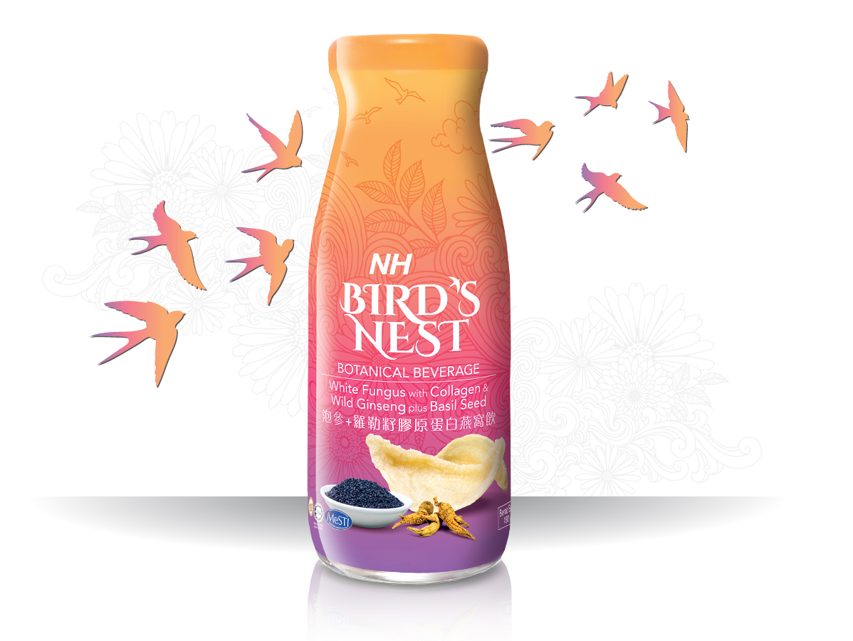 • Combined goodness of genuine bird’s nest with marine collagen, wild ginseng, white fungus and basil seeds.
